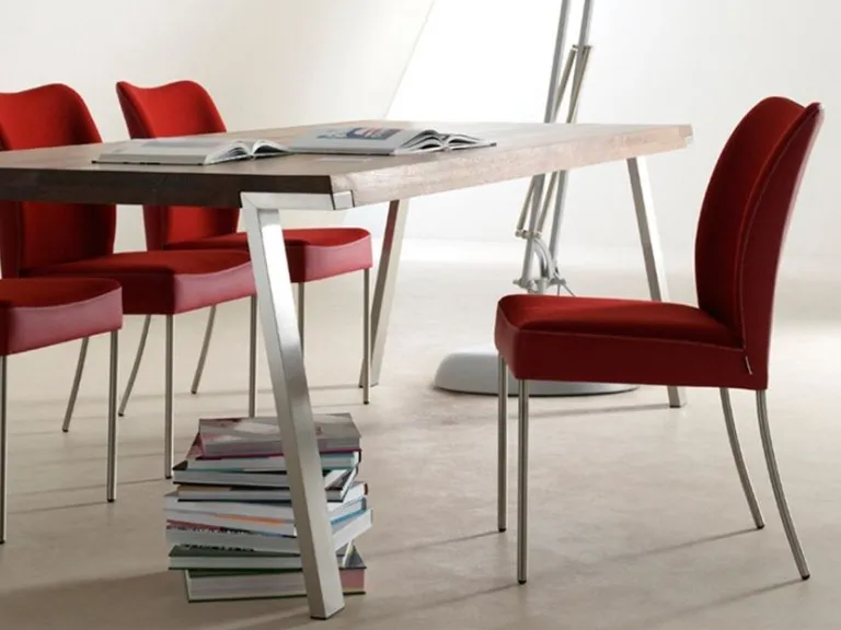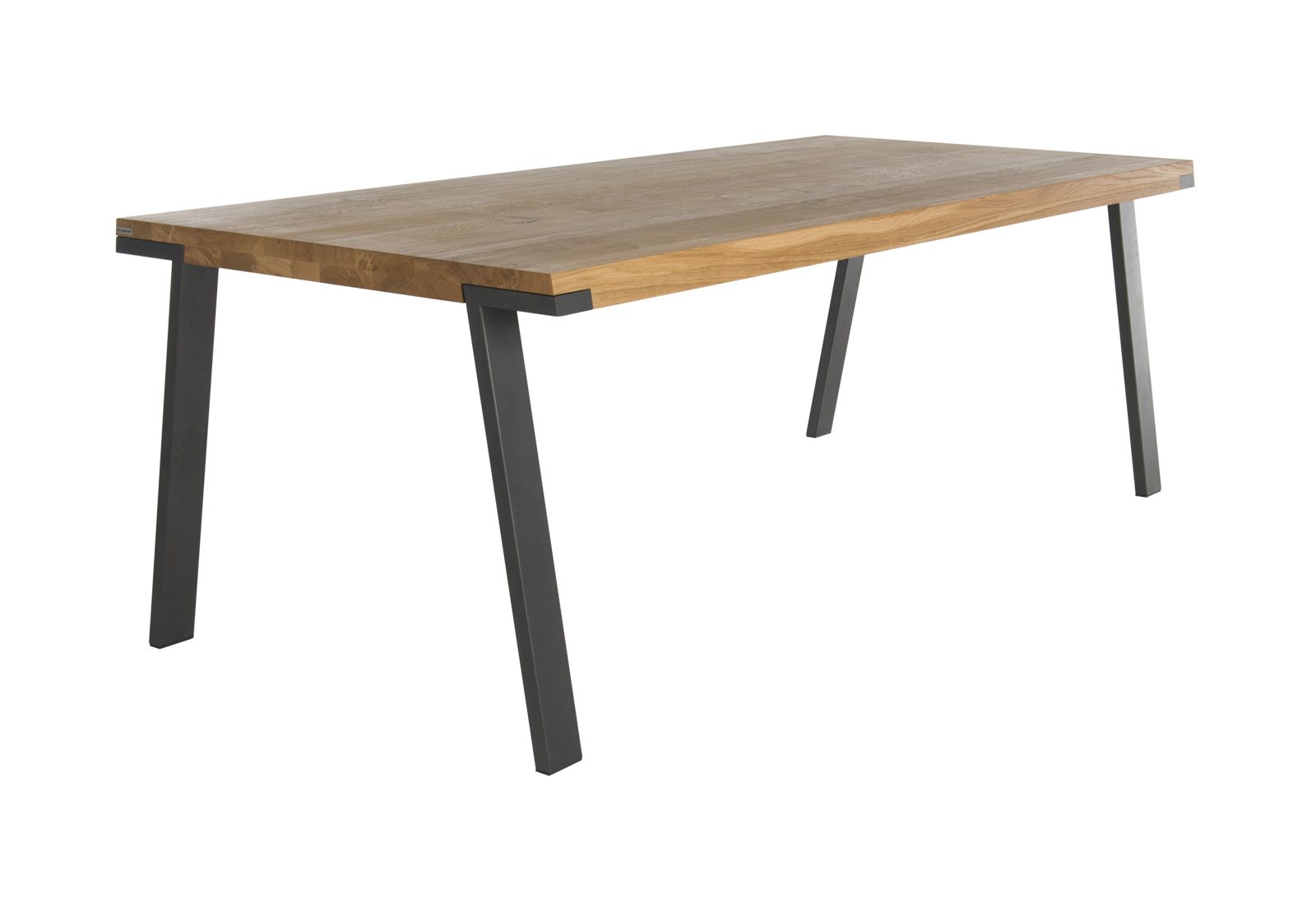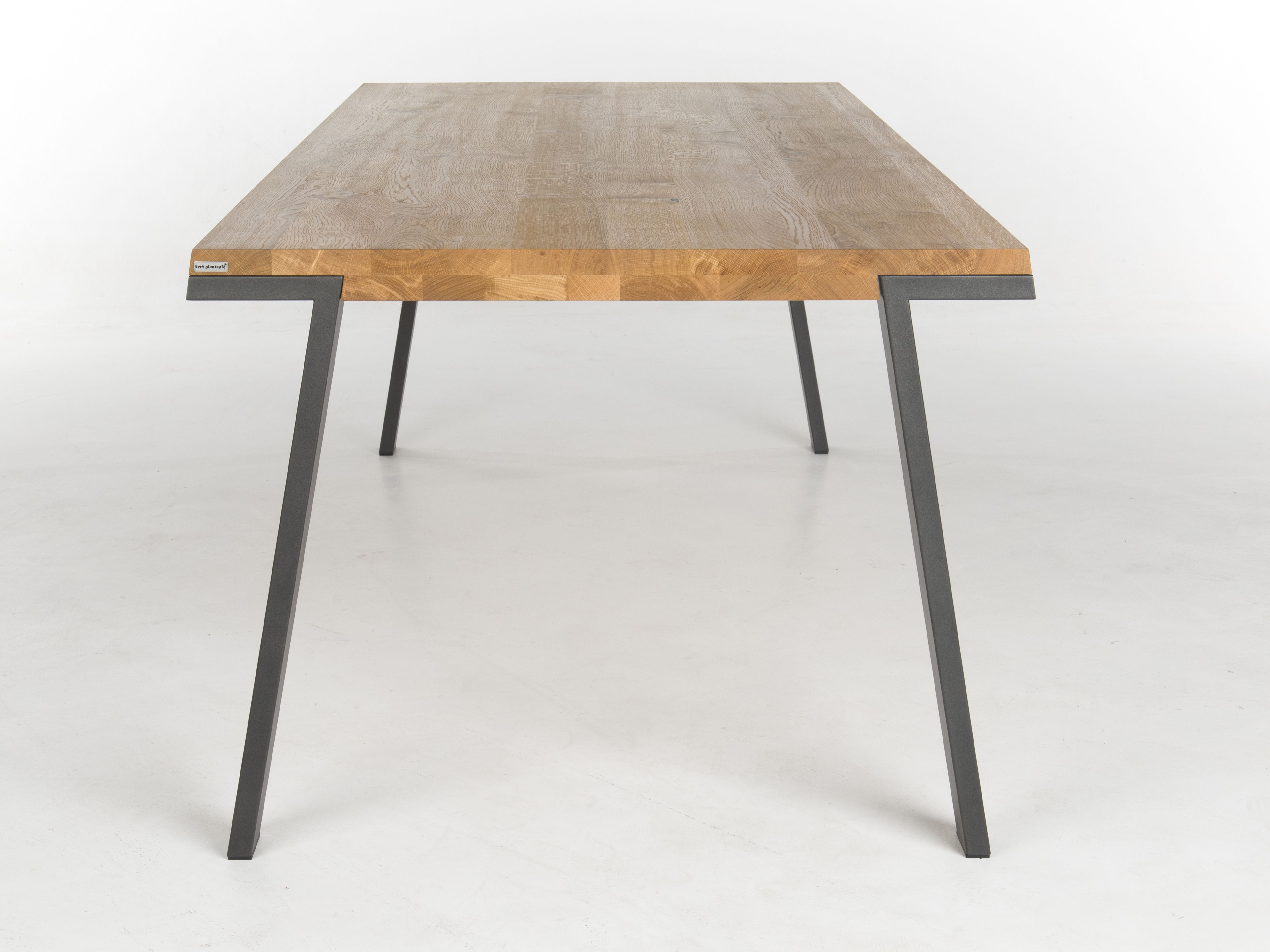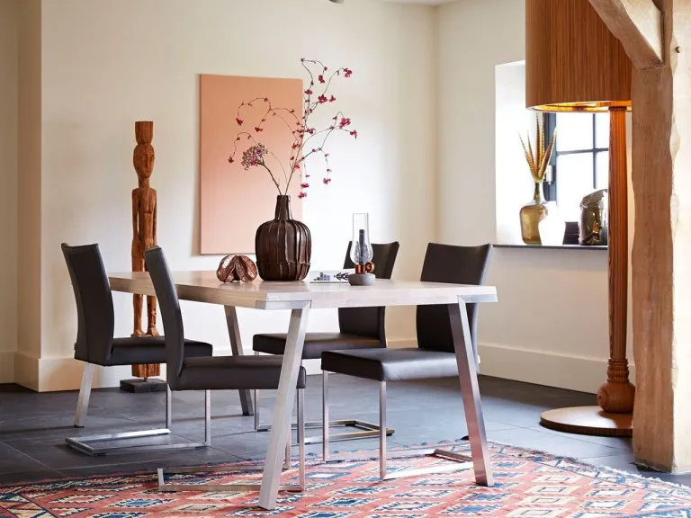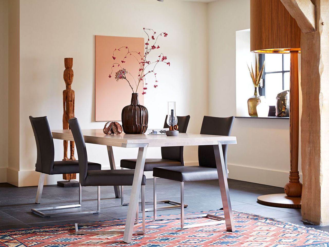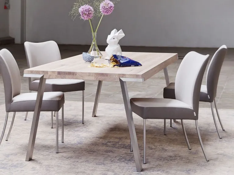 Deze uitgesproken eetkamertafel van Bert Plantagie heet Seven. Eigenlijk moet je gewoon het getal 7 schrijven en als je goed naar het cijfer kijkt en dan naar de poten, dan herken je de lijn van de 7 direct. Het lijkt erop dat deze eetkamertafel een schuin belijnde stalen poot heeft. Dit maakt deze tafel geschikt voor eetbankjes. Door de ruimte die ontstaat bij de poten, schuif je makkelijker aan.