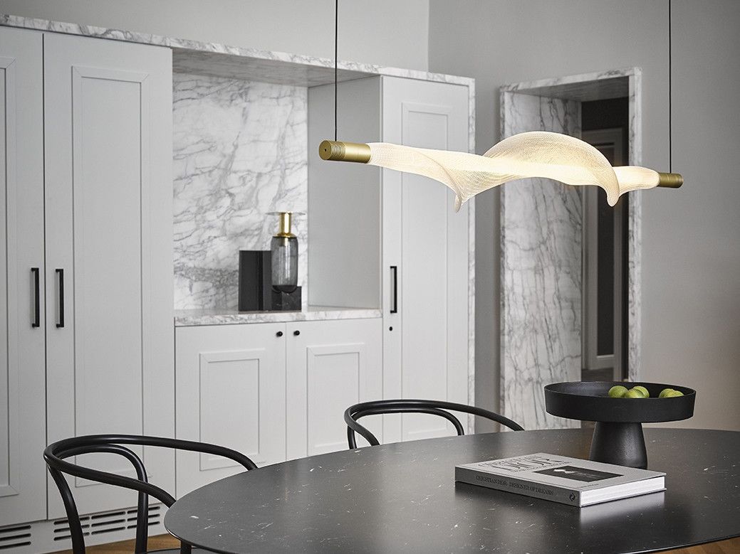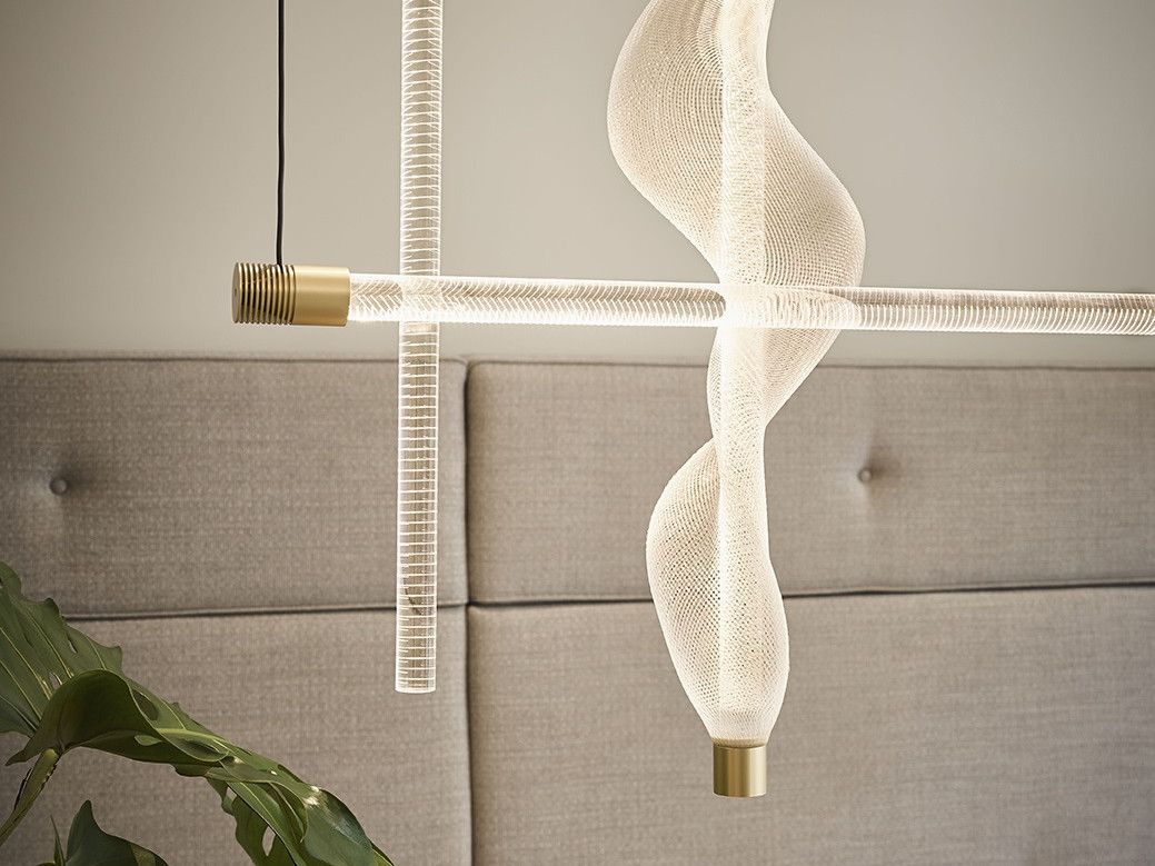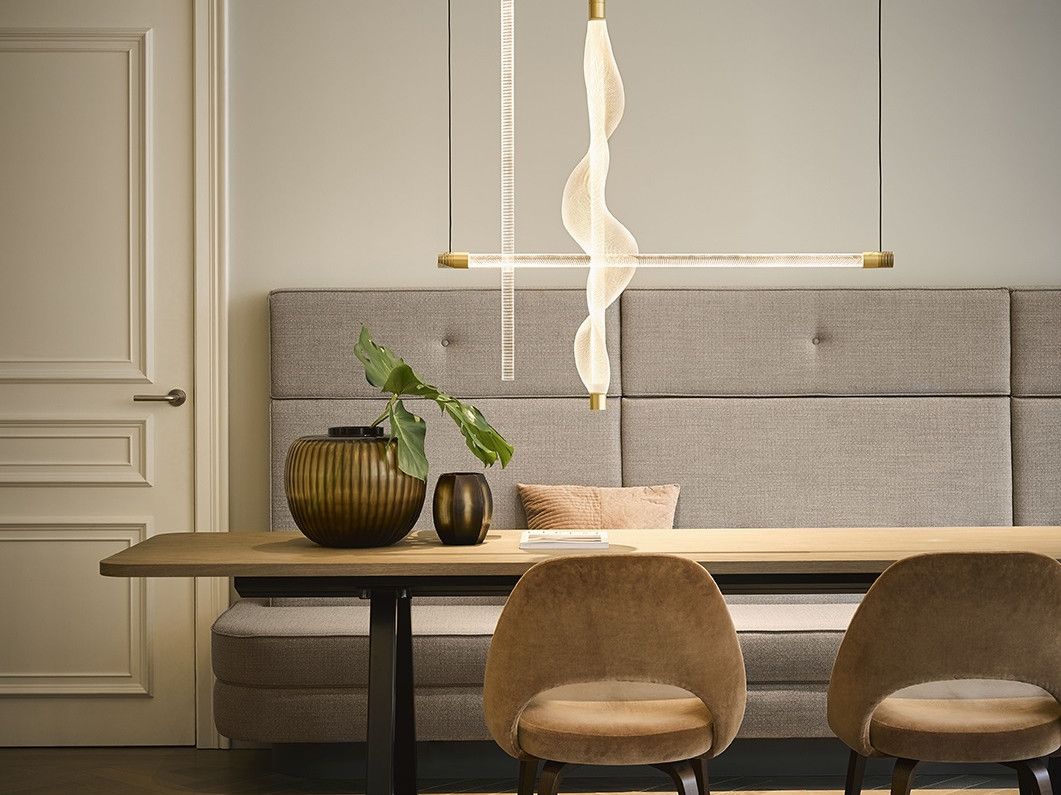 Hollands Licht hanglamp Vapour geinspireerd door het effect van rollend water of damp (vapour) dat zich golvend door de lucht verplaatst. Een sierlijke sleeve die met het licht lijkt te spelen en een ledbuis van geëtst glas laten een studie zien naar lichtbreking en –uittreding. Dit indrukwekkende lichtobject wordt voor het eerst onder de vleugels van Hollands Licht gepresenteerd.