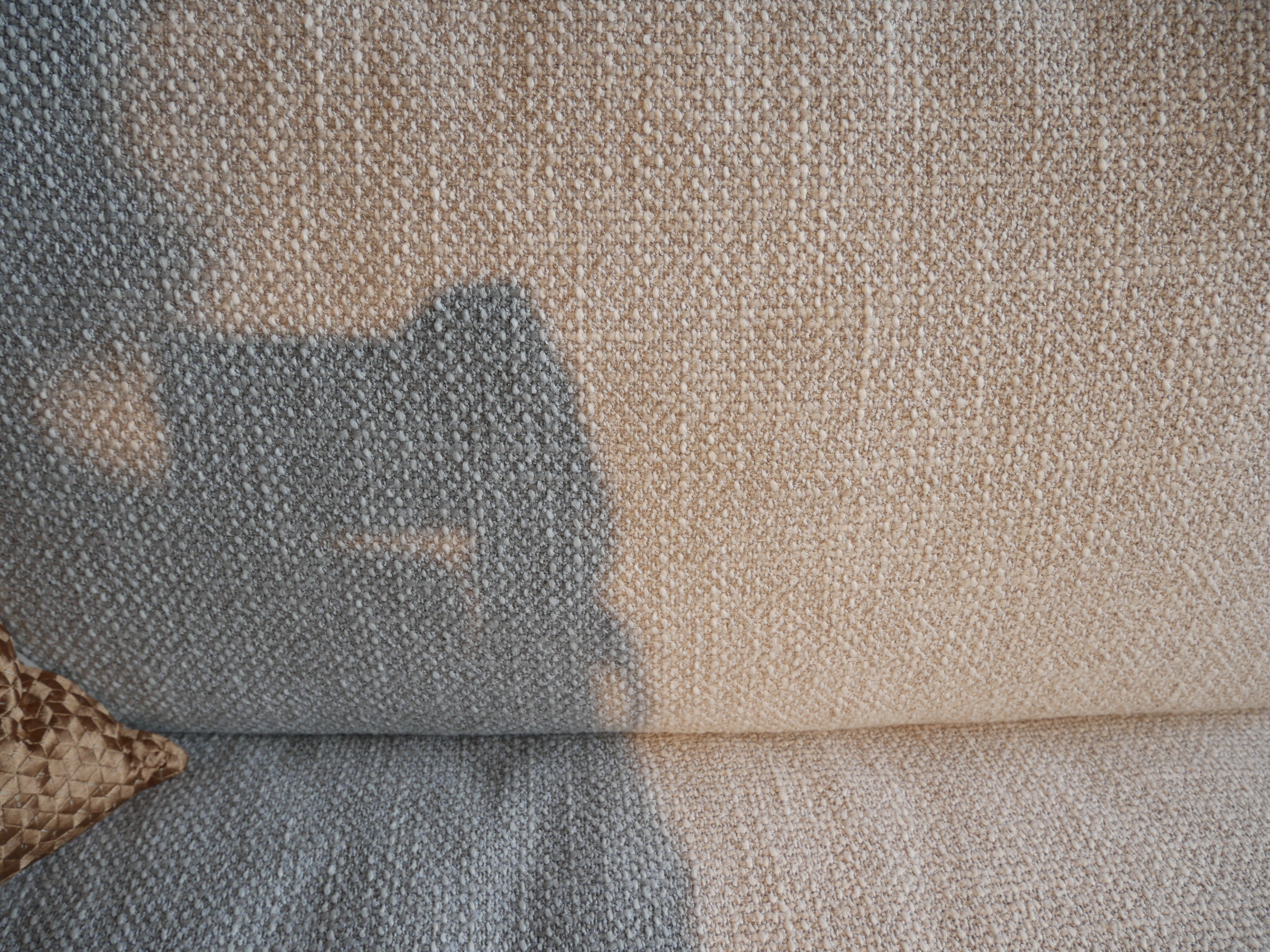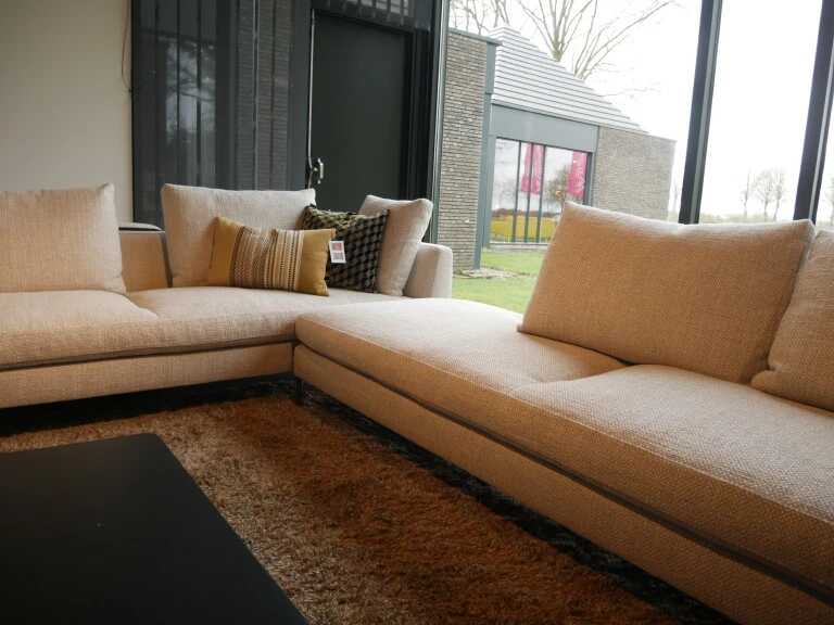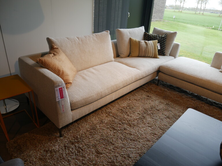 De hoekbank Daily soft in stof Girona 100 hebben we in de opruiming. De afmeting van de bank is 275 x 343 cm. De bank bestaat uit een 4-zitsbank en een 4-zitsbank dormeuze inclusief 6 losse rugkussens. De pootjes zijn uitgevoerd in zwart chroom
