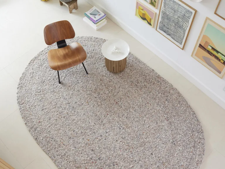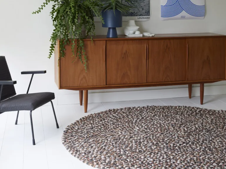 Roundabout is onze enige ronde structuur. De vlecht die gebruikt wordt bij het maken van dit vloerkleed bestaat altijd uit drie draden. Het is hand gevlochten met 100% Nieuw-Zeelandse wol (met een jute kern) in het noorden van Marokko. Roundabout Mix is leverbaar in diverse kleurencombinaties (zelf samen te stellen uit 2 of 3 kleuren) en in iedere gewenste afmeting (tot een maximale diameter van 500 cm.).