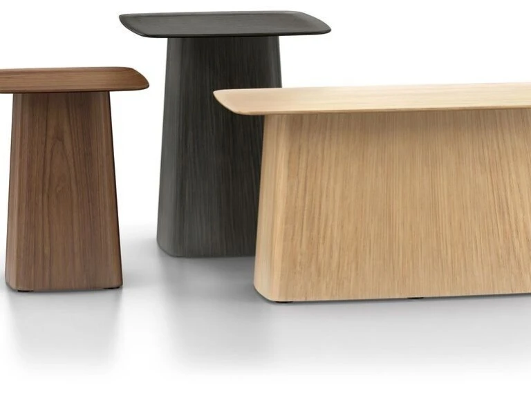 De slanke tafelbladen van de Wooden Side Tables van Ronan en Erwan Bouroullec hebben een licht gebogen rand, waardoor ze een elegante, bijna Japanse uitstraling krijgen. De lichte bijzettafeltjes zijn verkrijgbaar in drie afmetingen met een afwerking van naturel eiken, donker eiken of noten.