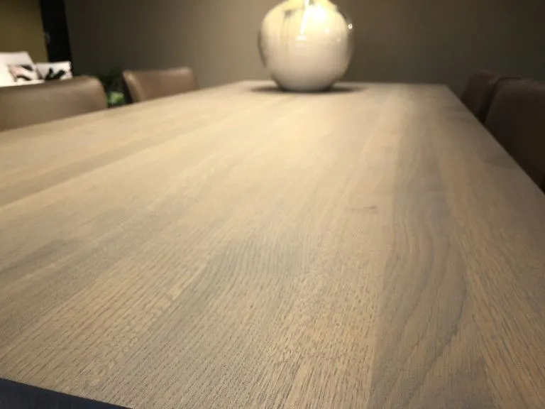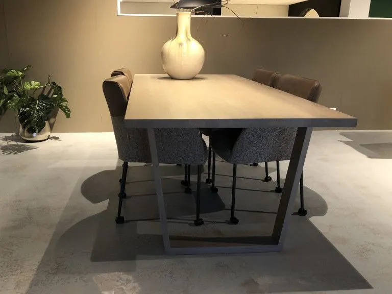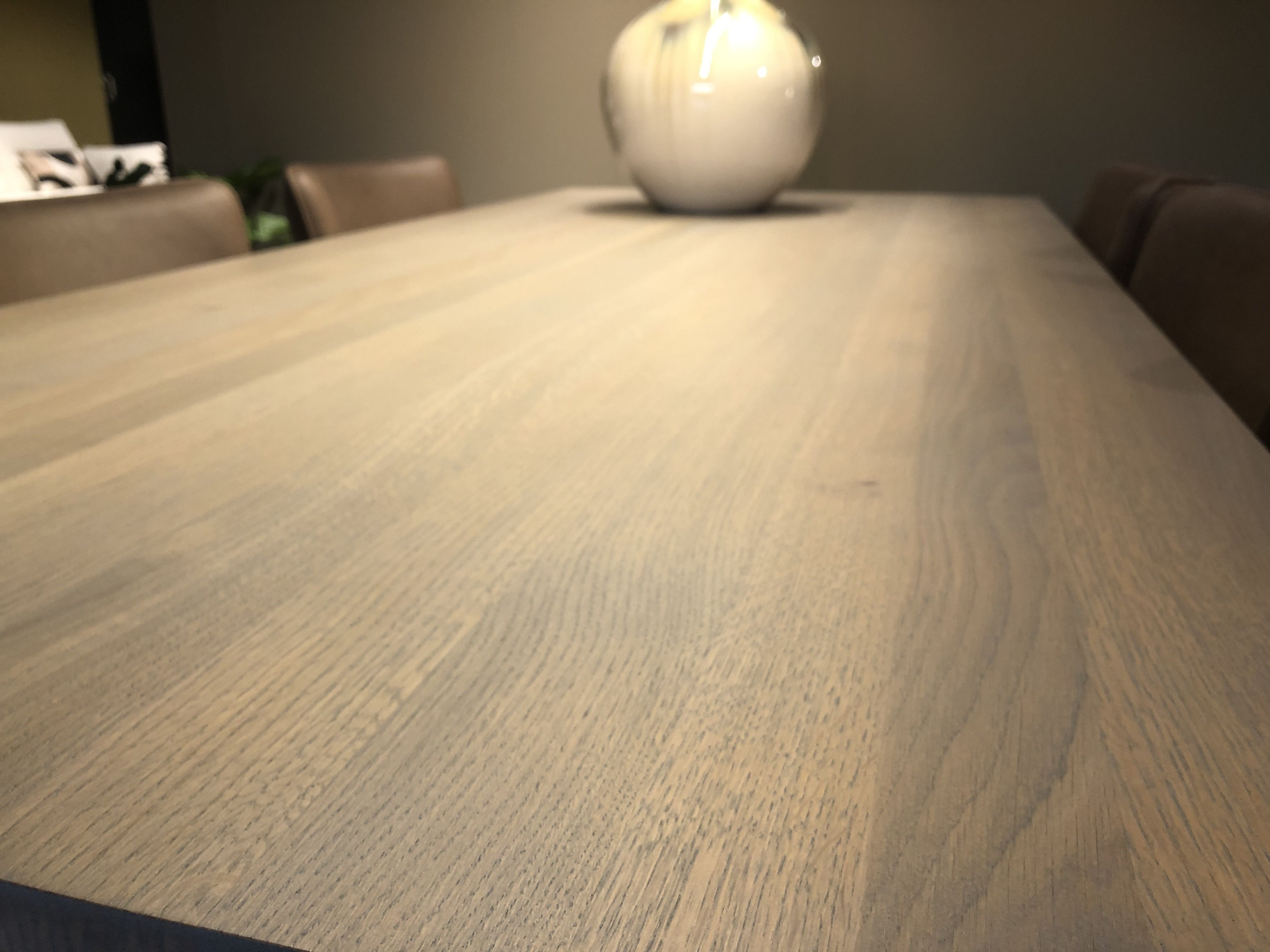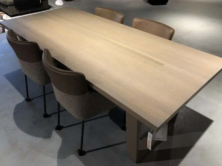 De eetkamertafel, model Blend van Bert Plantagie, staat bij ons in de opruiming.